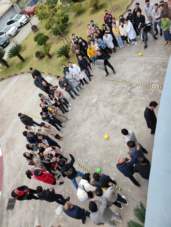 四、快乐投球:投出的是球,考验的是力量和感觉。投篮的人都知道,投篮时的手臂力量很重要,力量不足,投不到地方。但感觉同样重要,投篮没有感觉,肯定投不中。而且我们这次比赛还让投球人蒙上眼睛,难度就更大。平常没有一点基本功,是投不出好球的。生产部的陆松负责投篮,比赛开始前只见陆松稳稳地站在那里,拍了几下求,先试投了下,找一下感觉,然后由工作人员蒙上眼睛,根据投篮方向,右手托着球,左手扶着球,平稳下呼吸,把球举到头顶,“呼”地一下。他听到一阵掌声,知道球投中了……最终生产部力挫群雄,获得冠军。